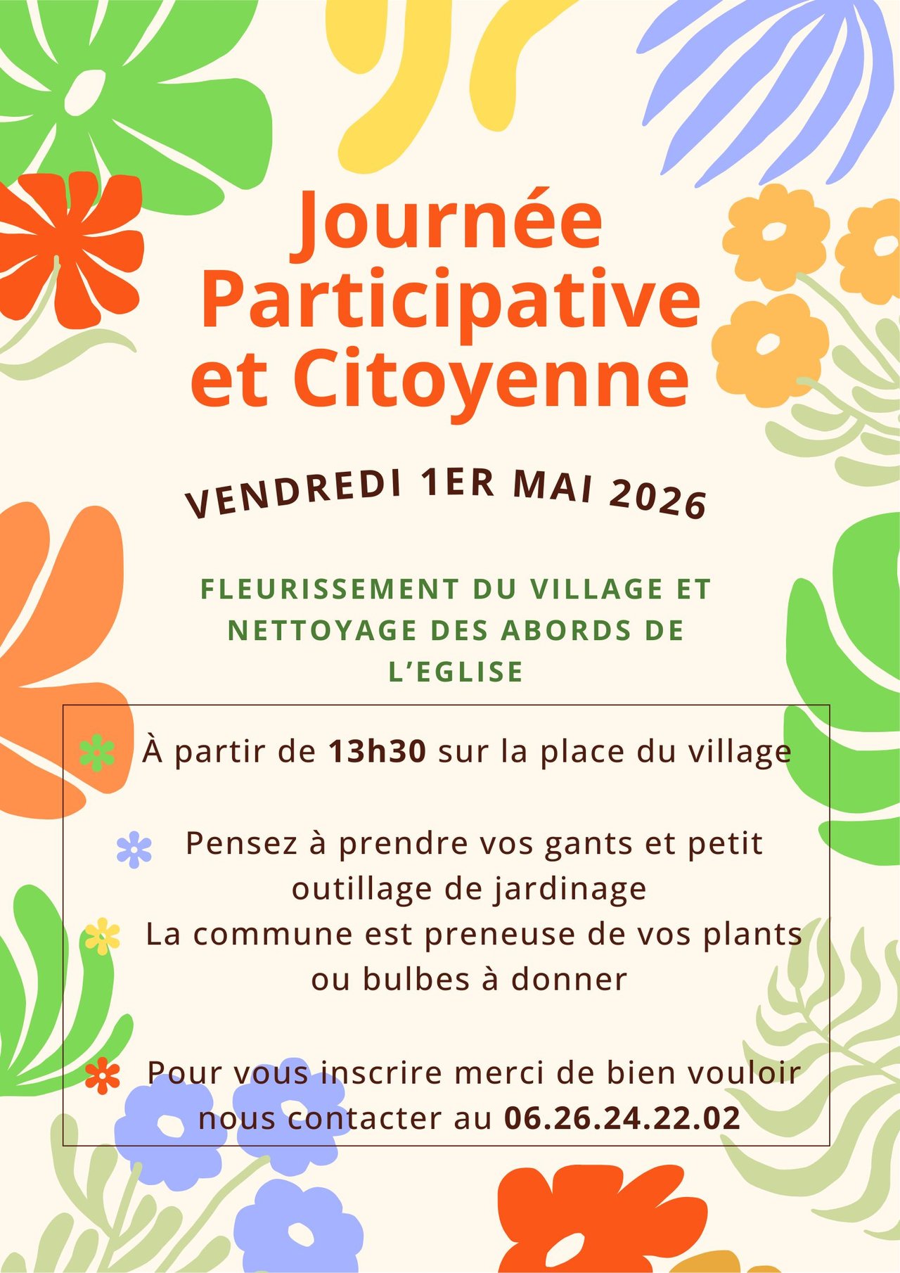 Nous avons le plaisir de vous convier le vendredi 1 mai, à cette journée qui a pour objectif l'embellissement du pourtour de l'église, le fleurissement du village, ...