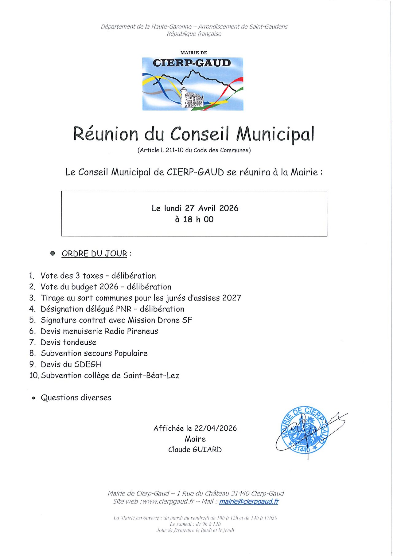 Réunion du Conseil Municipal se réunira le lundi 27 avril 2026 à 18h à la mairie.